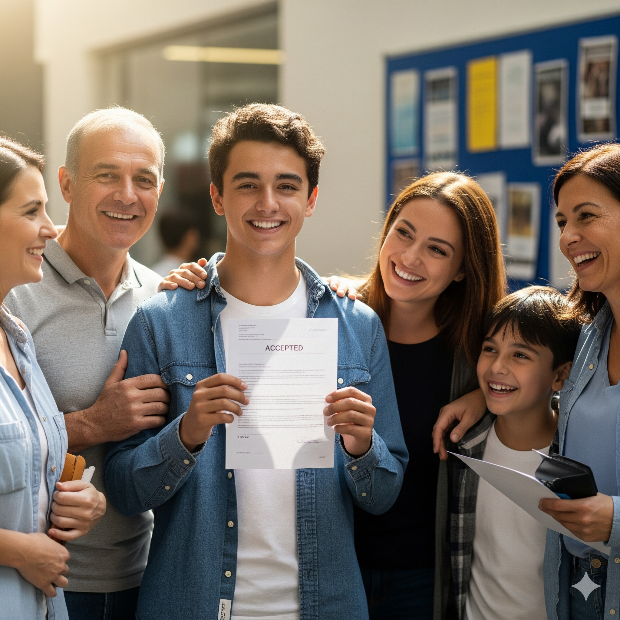 📸 이미지 #6: 합격 통지서를 확인하고 환하게 웃는 수험생과 가족의 모습