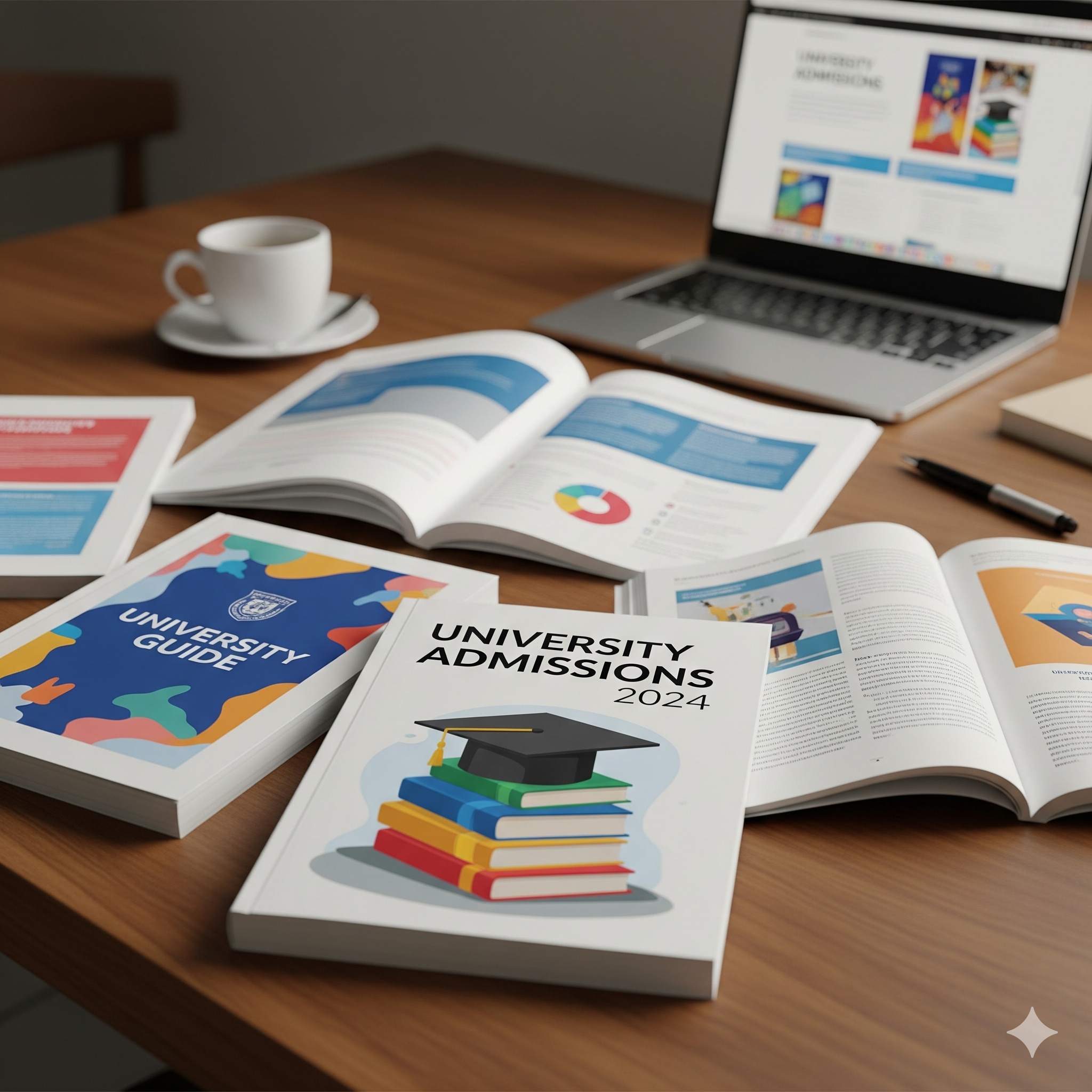 📸 이미지 #3: 여러 대학의 입시 요강 책자가 책상 위에 놓인 이미지
