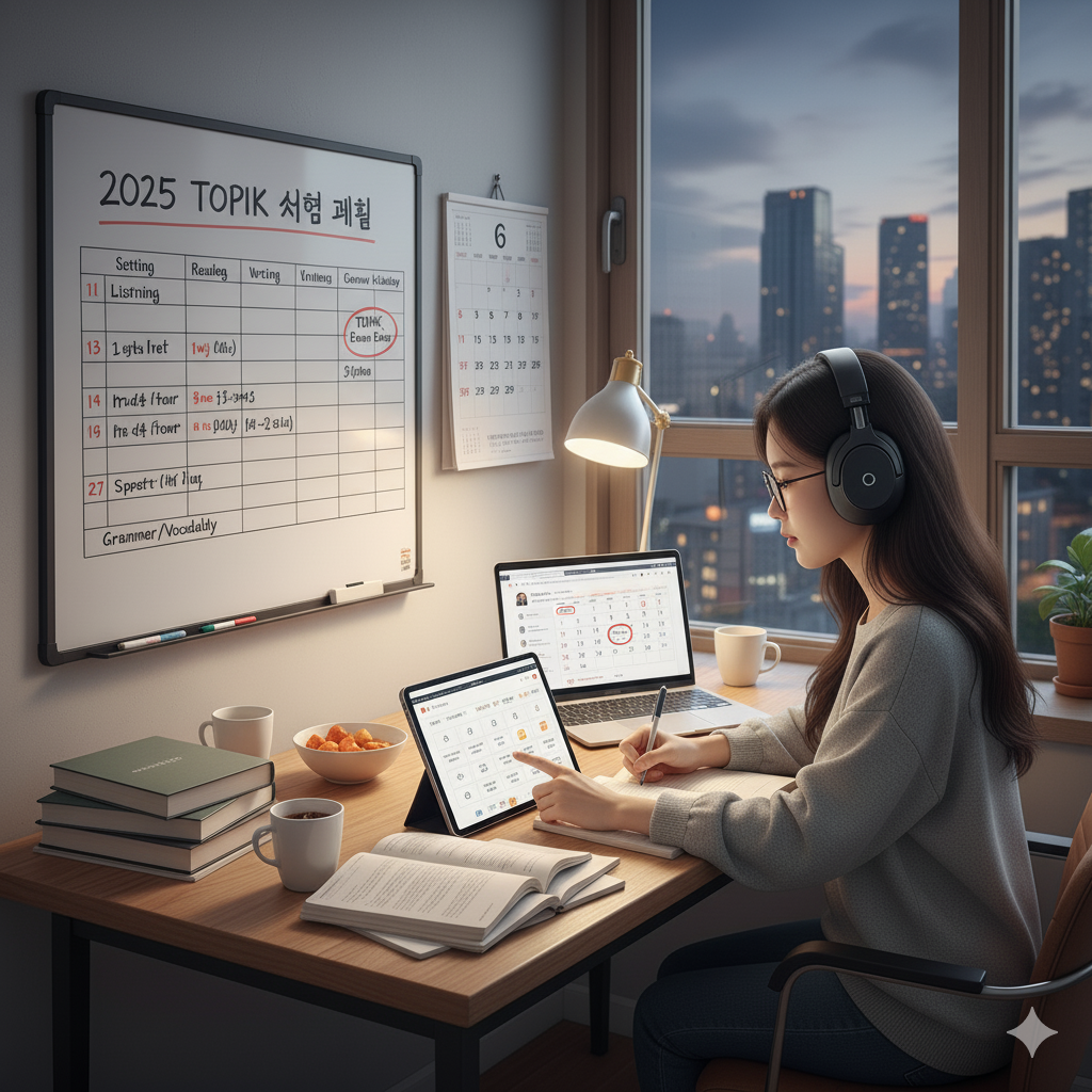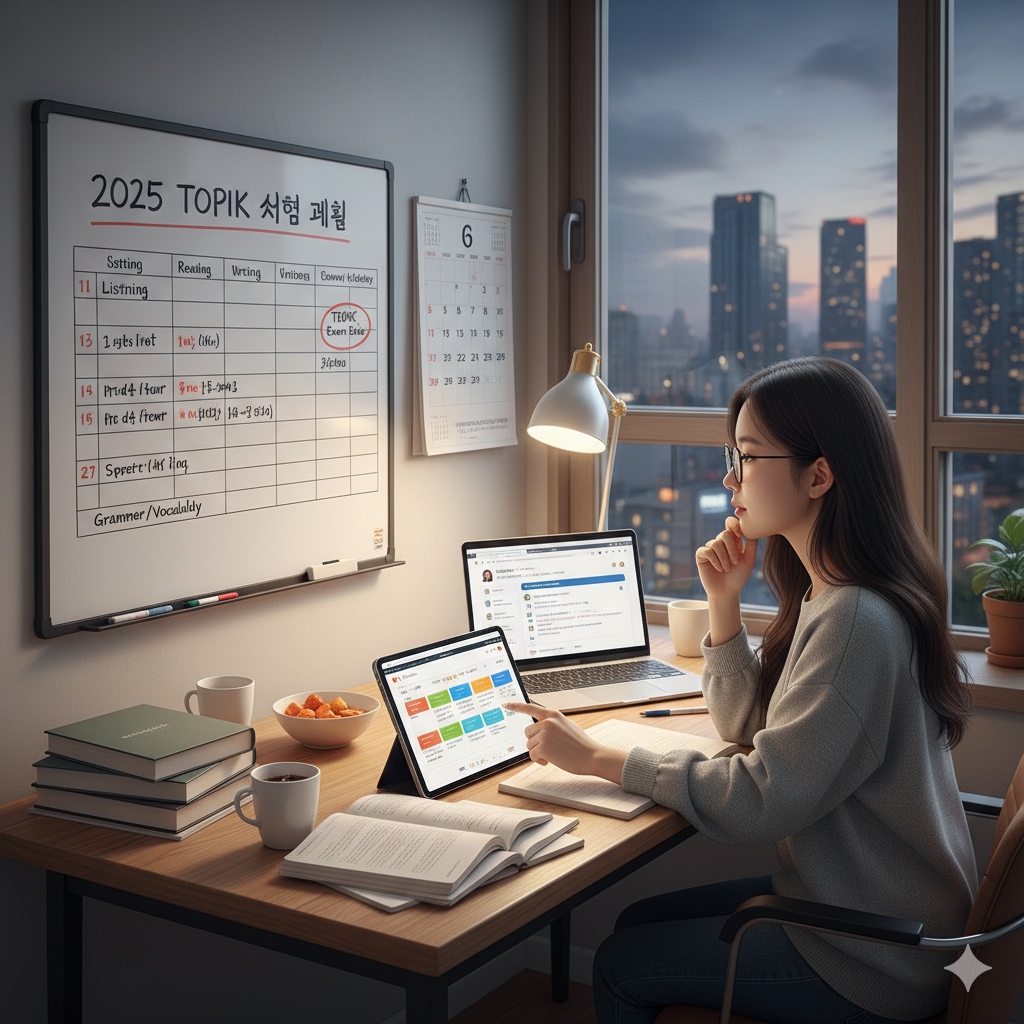📸 이미지 #1: 2025년 TOPIK 시험을 준비하며 계획을 세우는 외국인 학습자