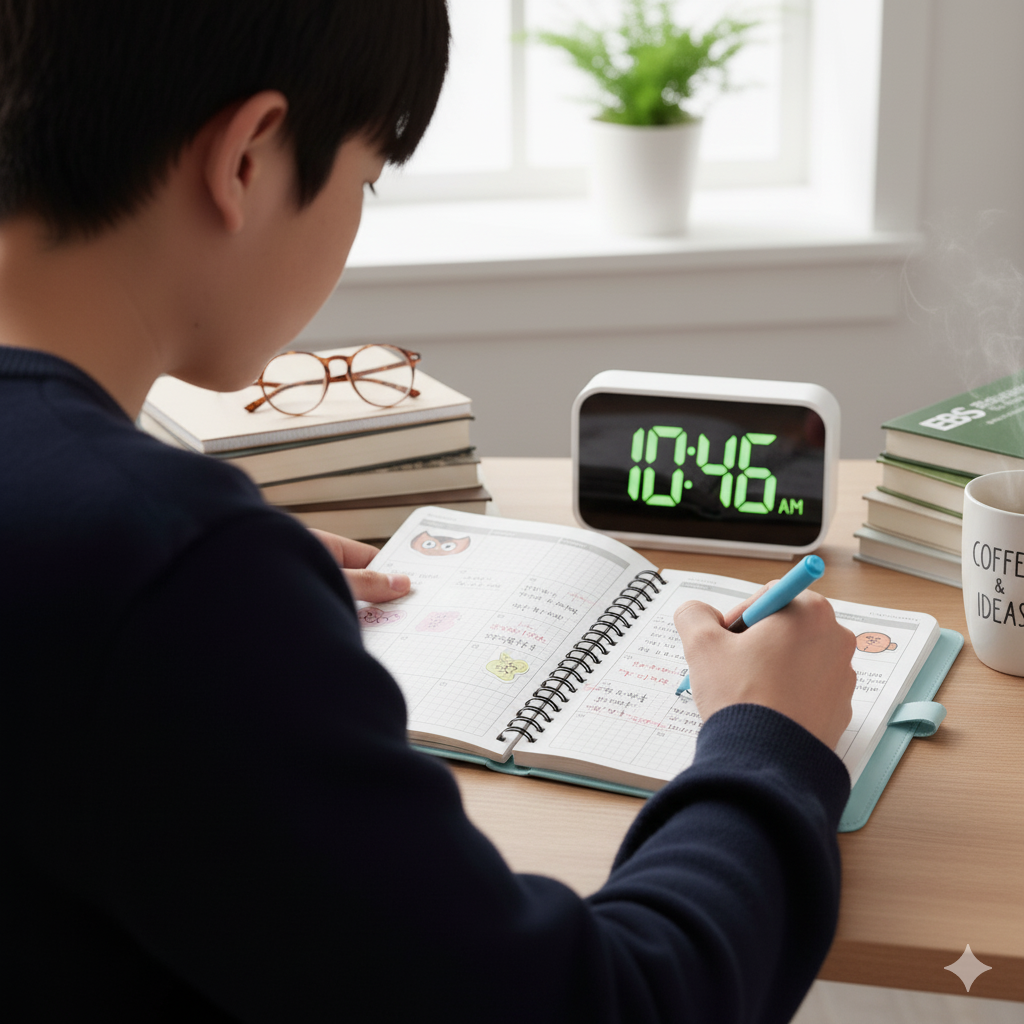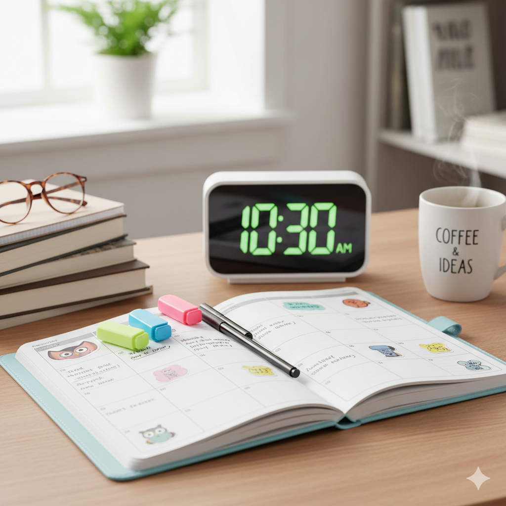 📸 이미지 #1: 스터디 플래너와 시계가 놓인 책상 이미지
