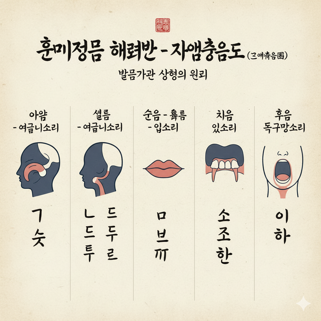 | 자음(子音)의 제자 원리 | 상형(象形)과 가획(加劃): 발음기관의 모양을 본떠 기본자(ㄱ, ㄴ, ㅁ, ㅅ, ㅇ)를 만들고, 소리의 세기에 따라 획을 더해(ㅋ, ㄷ, ㅌ, ㅂ, ㅍ, ㅈ, ㅊ, ㅎ) 체계적으로 확장했습니다. |
